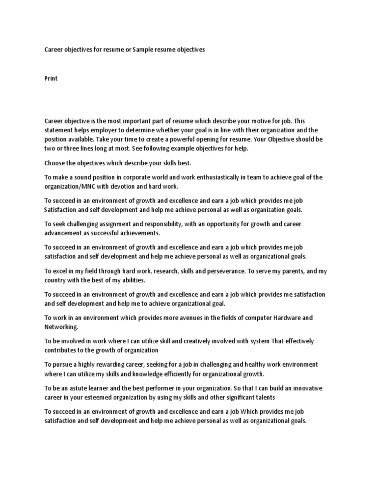 These may be placed at the top of a resume to make it clear that you are interested in a job. A resume objective is typically one or two sentences long, and can be tricky to write given the space limitations. To write a career objective that is not too broad or too narrow. Introduction a job campaign consists of many tasks: You can add a resume objective.